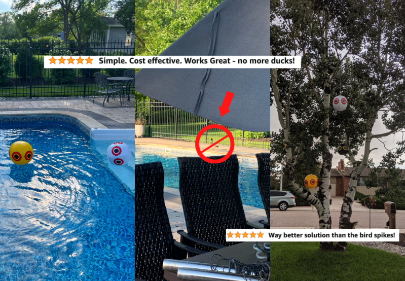 Amazon reviewer Julie was also in the same boat as me (the doubt, not playing volleyball) at first, saying “Read reviews and thought, ‘There’s no way these eyeballs will repel ducks from landing in my pool after dealing with this every year for the past 5 years.’ Well… I was wrong! Haven’t seen one duck yet!! No poop on the concrete around the pool and no poop in the pool. I’ve been using them for over a week now. Those reviews saved me $100 bc I was going to purchase two owls. Thank goodness I tried these first!!”