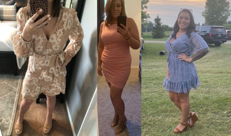 “I bought this dress in two colors and in two different sizes (red-L and sage-XL). Out of the two, the red Large fit the best; skimming my curves and holding me beautifully in all the right places. For a point of reference, I am curvy, 195lbs, 5ft 3inches, 38 DDD, hourglass shape, with a pretty noticeable c-section pouch from my 4 kiddos. I typically wear a size 14-16 jean and large top.