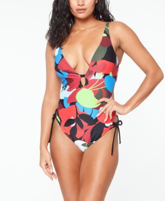 Qearal’s monokini shows off the stomach while covering the back; while this abstract, multi-colored monokini from Bar III does the opposite. The front of this striking suit features a deep v-neck plunge with a flirty keyhole cut-out and full, smoothing torso coverage. From the back, the monokini splits into a two-piece style, keeping you feeling free and breezy even after your fourth hour by the pool.
