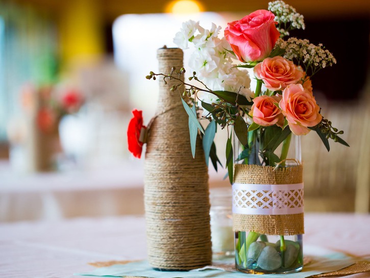 You can keep your twined wine bottles as is, or glue embellishment such as lace, buttons, or flowers to the front to decorate them even further. You can the finished bottles in the same way you’d use painted wine bottles above to make lamps, vases, decorations, and DIY wine bottle centerpieces.