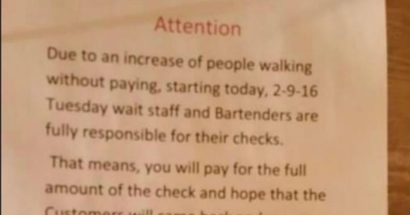 Yet that didn’t stop this restaurant from trying to intimidate their servers into picking up the tab for dine and dashers so that the restaurant wouldn’t have to take the loss. This sort of behavior is actually highly illegal and the United States Department of Labor expressly forbids policies like it. According to their website, “Where deductions for walk-outs, breakage, or cash register shortages reduce the employee’s wages below the minimum wage, such deductions are illegal.”