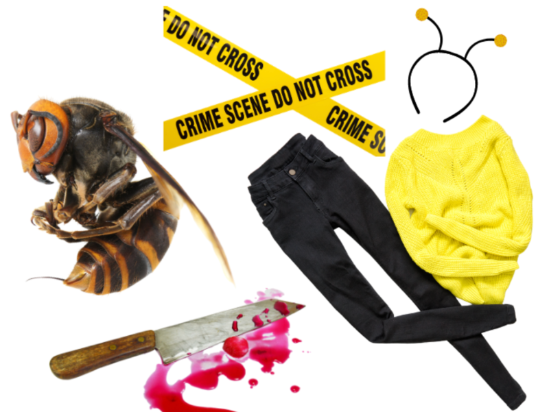Hornet: Contrail1/Getty Images; Crime Scene Tape: Michael Burrell/Getty Images; Outfit: Serhii Yevdokymov; Headband with Antennae: DKDesignz; Knife with Fake Blood: Pedphoto36pm/Getty Images; via Canva.com