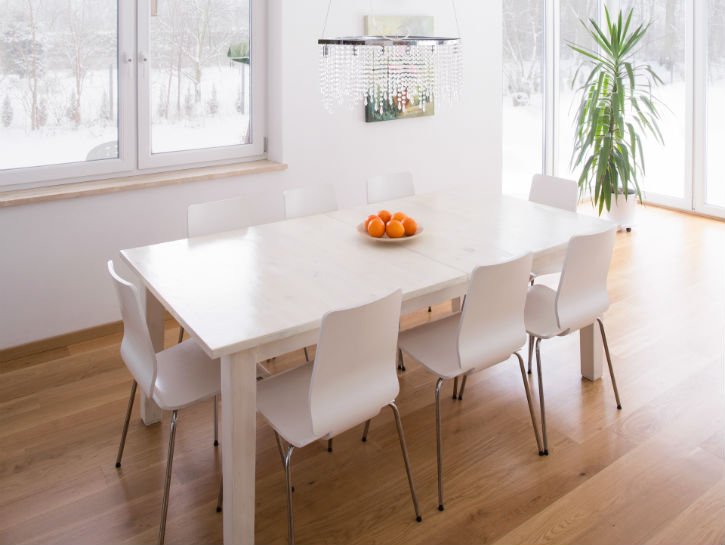 The table and chairs you choose need to reflect your needs and your tastes. It’s important not to buy a large table if you won’t be having big gatherings. Choose a round table if your home is smaller, as it allows you to fit more guests without taking up lots of space. You want to find a table that fits comfortably in the room that also allows people to move around it with ease. Chairs are more straightforward — you want to pick matching chairs that are comfortable and a proper fit for the table. The arms of your dining room chairs should be able to slide fully under the table.