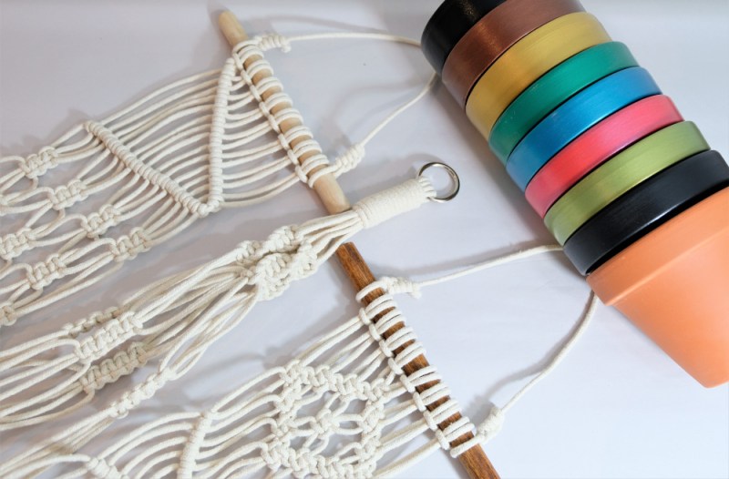 Gently place finished plant into string hanger. Tie the strands together at the top. Add a hook for hanging, and find a place for your greenery to pop! We love in windows or against office walls. Repeat this project until you have groups of hanging planters to pair together for an even cooler look. Mix it up with different colored string and shapes of succulents for an eclectic blend.