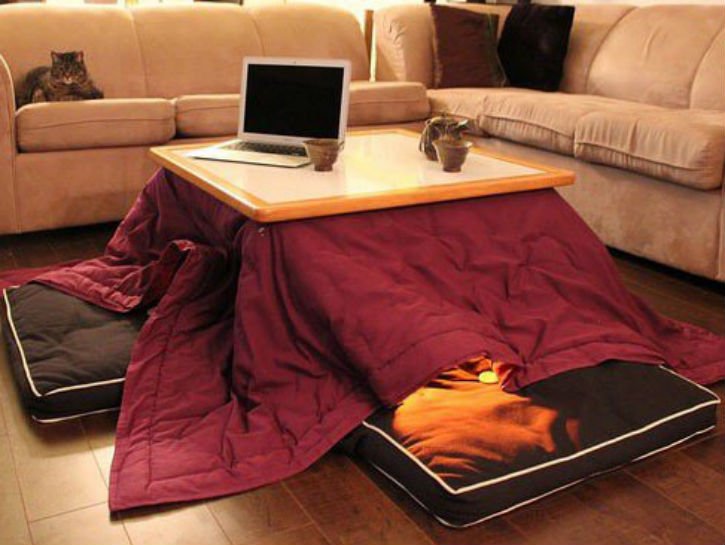 Kotatsu tables are extremely popular in Japan, mainly because Japanese homes are not insulated well, and this is an inexpensive way to keep warm during the winter. In Japanese culture, it is not unusual for people to sit on the floor, and this table is perfect for that. Some also use a zaisu, which is a floor chair that gives you a backrest.