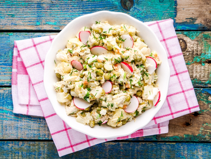 This recipe mixes together eggs, celery, relish, onions, mayonnaise, mustard and, of course, potatoes to make a delicious creamy side dish. Adjust the amount of mayo in the recipe to make it more or less creamy to your liking. For the best results, try using baby potatoes — they have a naturally sweet flavor that works well with this recipe.