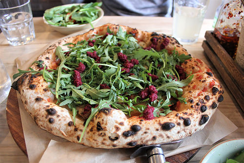 Brush crust with olive oil. Spread on the ricotta, then top with roasted squash, greens, raisins, and onion. Season with salt and pepper.