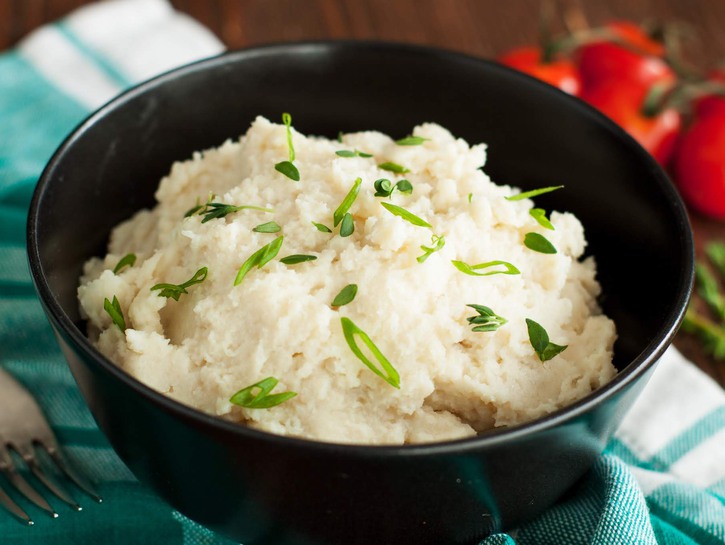 Enjoy a generous helping of creamy cauliflower mashed “potatoes” without all those pesky carbohydrates and calories. One-sixth of a medium cauliflower head contains only 25 calories and five grams of carbs, while one potato contains 110 calories and 26 grams of carbs. It’s no wonder that cauliflower mash is such a popular alternative to mashed potatoes!