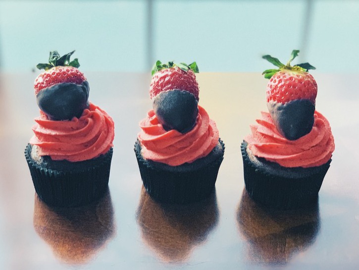 Once cupcakes are cool, frost with strawberry buttercream frosting and top with chocolate-covered strawberries. Store cupcakes in an airtight container in the refrigerator.