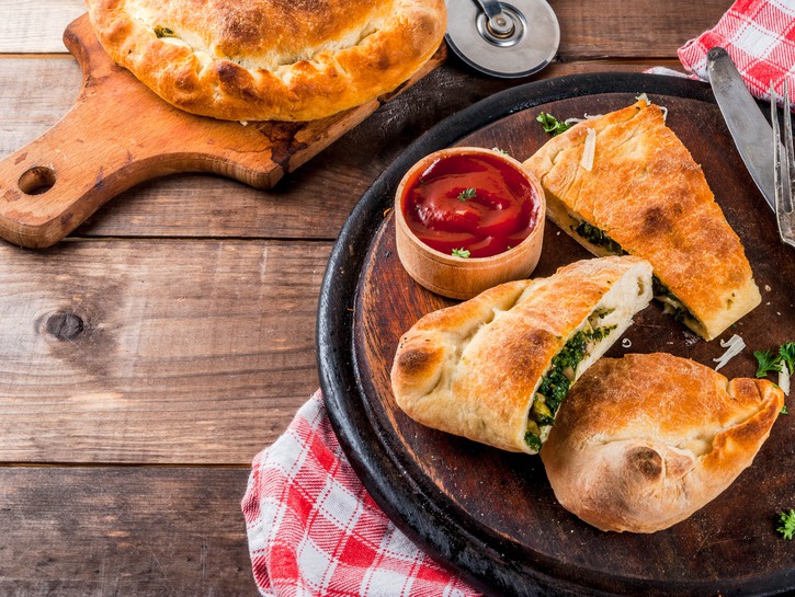 Unlike the calzone, stromboli does not have Italian roots; it was born in Philadelphia in the 1950s. A calzone consists of only one layer, while stromboli consists of several layers — a result of the pizza dough being rolled into a pinwheel. While a calzone resembles a turnover, stromboli resembles a loaf of bread. Like the calzone, however, stromboli is stuffed with cheese, vegetables, meat, and sauce.