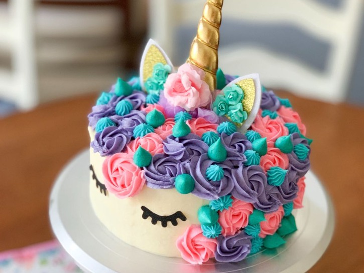A unicorn cake is a whimsical and enchanting dessert perfect for your child’s birthday celebration — it’s guaranteed to be a sugary showstopper! Our delicious homemade strawberry cake is coated with smooth vanilla American buttercream and decorated with buttercream rosettes, stars, and rounds in soft pastels. We used a simple unicorn cake topper kit for the horn, but you can prepare a fondant horn instead of using the kit.