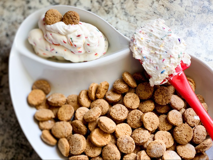 Add the rainbow sprinkles using a silicone spatula. Serve your vanilla rainbow sprinkle frosting as a dip with your cinnamon graham cookies! Enjoy!