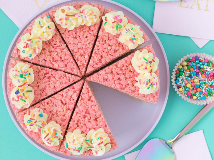 Not many can resist the soft, buttery, gooey satisfying marshmallowy stretch of a delicious Rice Krispies treat! That’s why these delectable pillowy treats make a terrific alternative to dense cake. Instead of traditional squares, the Rice Krispies are cut to resemble a slice of cake. The Cake Slice Rice Krispies have layers of color to mimic traditional cake. It’s then dressed in delicate beehives of vanilla buttercream and then garnished with rainbow sprinkles for a dash of fun.