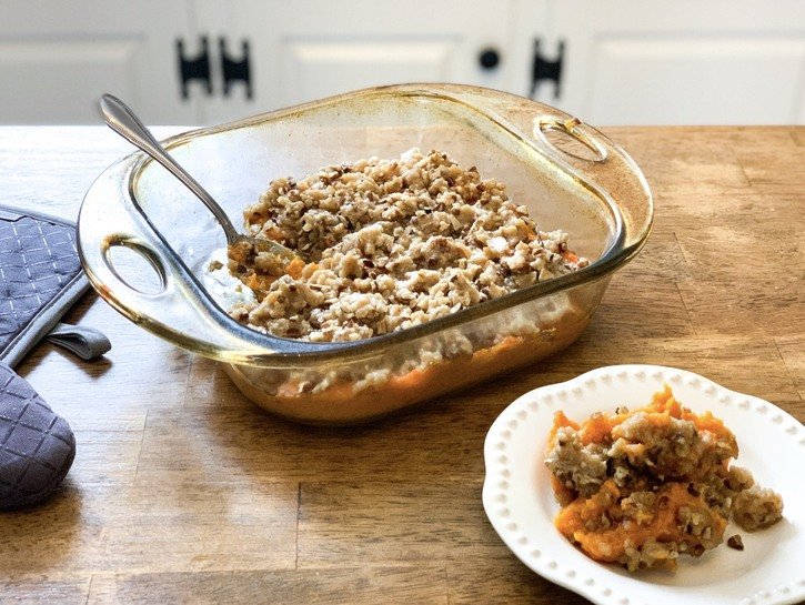 Sprinkle the streusel mixture on top of the sweet potatoes in an even layer. Bake until set and golden on top, about 30-40 minutes. Serve warm. Enjoy!