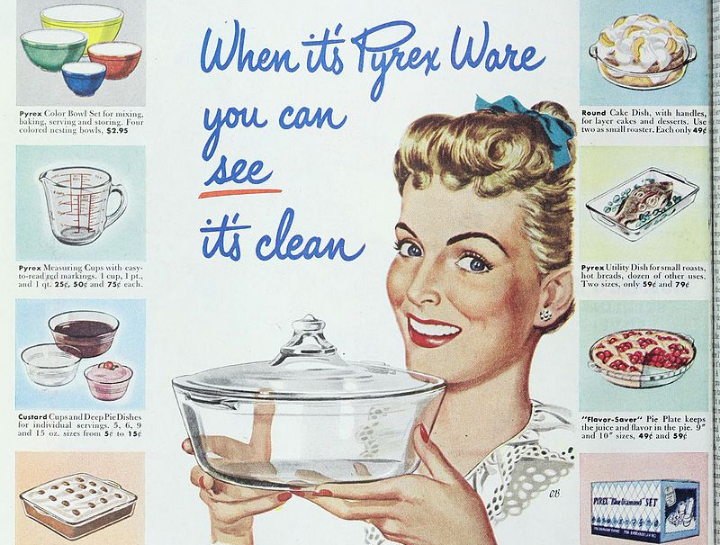 Pyrex is derived from the company’s tradition of using “ex” at the end of their product names and the Latin prefix “pyro.” Originally advertised as “fire-glass,” Pyrex could withstand drastic temperature changes, didn’t discolor or retain food smells, and didn’t react with ingredients to change the overall flavor like cast iron. Additionally, the clear glass allowed bakers to watch the sides of their cakes, pies, and casserole brown in the oven. The new kitchenware was an instant hit, selling four million pieces in its first four years of production and twenty-six million pieces over the following eight years.
