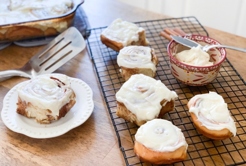 Using a small offset spatula, spread the warm cinnamon rolls with the cream cheese frosting. Serve immediately. Enjoy!