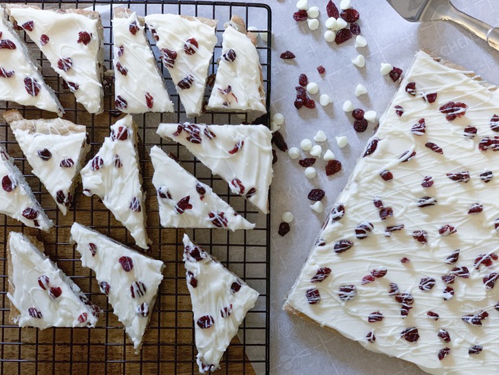 Next, place white chocolate chip and 1/2 teaspoon of shortening in a small microwave-safe bowl. Microwave in 15-30 second increments until smooth. Dip a fork into the melted chocolate and gently shake over the cranberry bliss bars to create a drizzled look. Slice the bars into triangles. Enjoy!