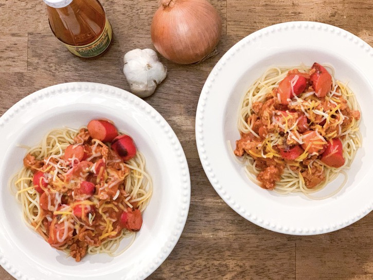 Red Filipino-style hot dogs and ground pork are blended in a sweet sauce, made with tomato sauce, and tomato paste sweetened with banana ketchup and sugar. Adding evaporated milk to this saucy dish helps it become thick and creamy. Filipino spaghetti is topped with grated quick-melt cheese, such as Velveeta.