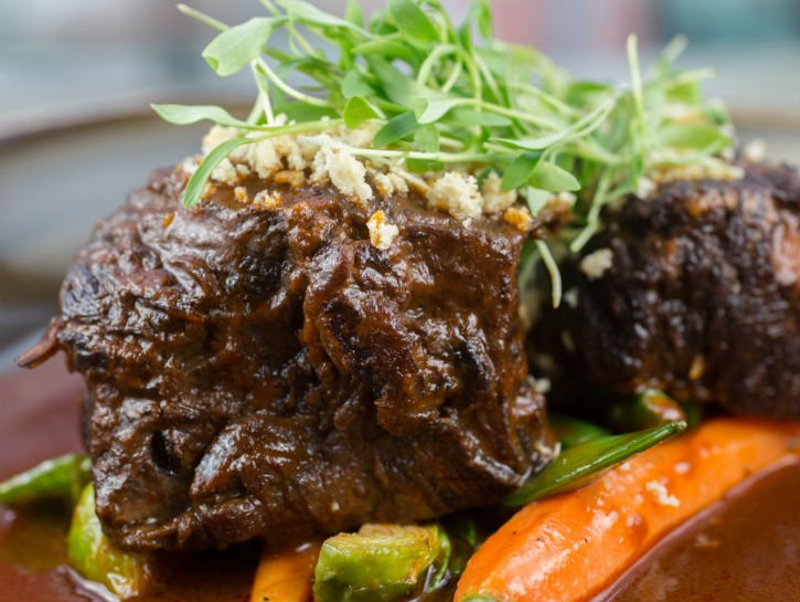 Braising is the method of cooking less-tender cuts of meat by partially submerging them in liquid and cooking them over a low heat for an extended period time. The big difference between this and ‘stewing’ is that stewing involves smaller cuts of beef completely submerged in the liquid and have an assortment of vegetables tossed into the mix, all to be consumed together. Braising uses larger cuts of tough meat and the slow-cooking process allows the meat to break down and become incredibly tender. Then the liquid is used to help season and flavor the beef to make a rich, mouth-watering dish.