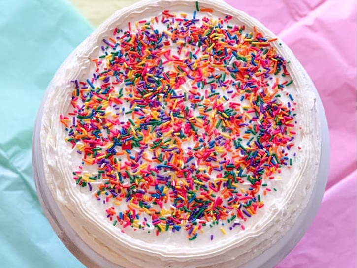 Place the rest of the frosting into a disposable piping bag fitted with a Wilton 21 piping tip. Pipe a border around the top and bottom edges of the ice cream cake. Add the rainbow sprinkles to the top of the cake. Place the cake back in the freezer for about 30 minutes.