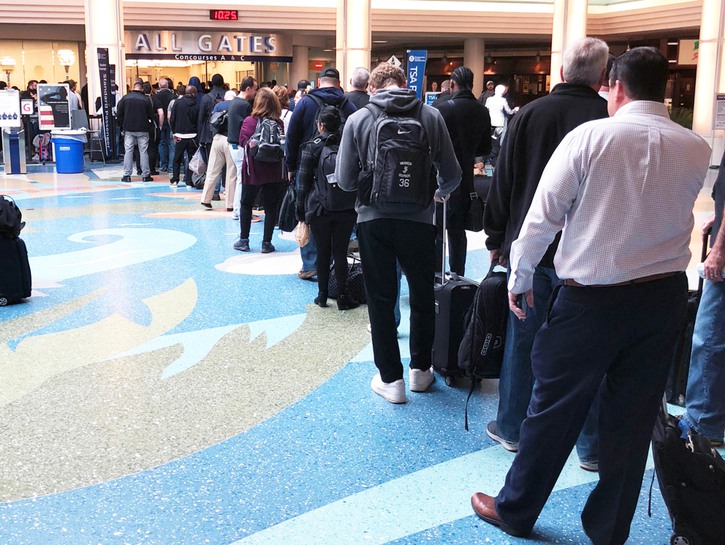 I had seen this coming and had dressed appropriately. I have several metal plates in my arm, legs, and head. I also have an insulin pump with a metal needle attached to my body. I always get pulled for a hand wand search, a pat-down, and a request to remove outer clothing. With this in mind, under my Levi jeans and t-shirt, I wore a sports bra, men’s boxer shorts, and slip-on tennis shoes. In line at the TSA checkpoint, I stripped down to the sports bra and boxers. I got through the TSA inspection reasonably fast. Semi-clad, I ran to my gate. I heard the last call for boarding my flight as I was running. I did make the flight and the agents held it while I slipped my jeans and shirt back on.